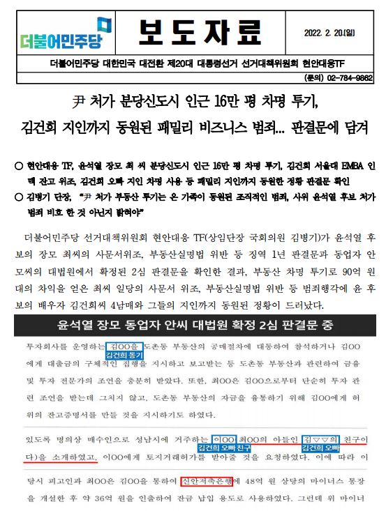 [보도자료] (더불어민주당 선대위 현안대응TF) 윤석열 처가 분당신도시 인근 16만 평 차명 투기, 김건희 지인까지 동원된 패밀리 비지니스 범죄.. 판결문에 담겨