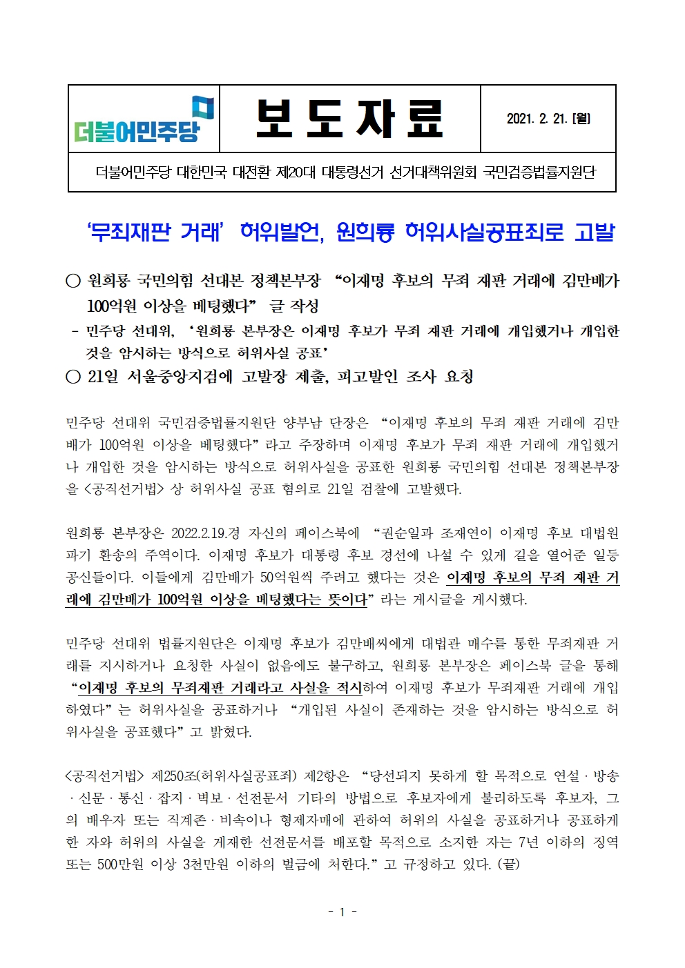 [보도자료] 더불어민주당 선대위 국민검증법률지원단, '무죄재판 거래' 허위발언, 원희룡 허위사실공표죄로 고발