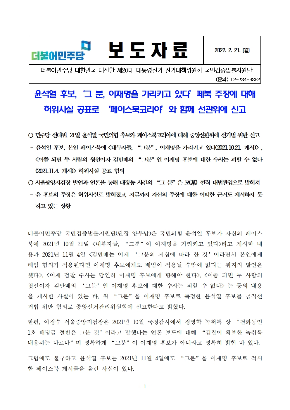 [보도자료] 더불어민주당 선대위 국민검증법률지원단, 윤석열 후보 페북 주장에 대해 허위사실 공표로 선관위 신고