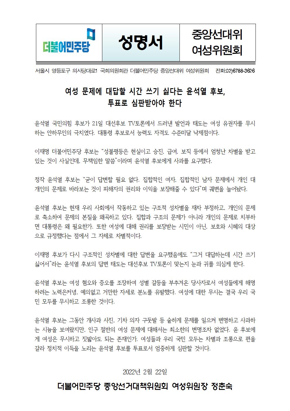 [성명서] 더불어민주당 선대위 여성위원회 여성 문제에 대답할 시간 없다는 윤석열 후보, 투표로 심판받아야