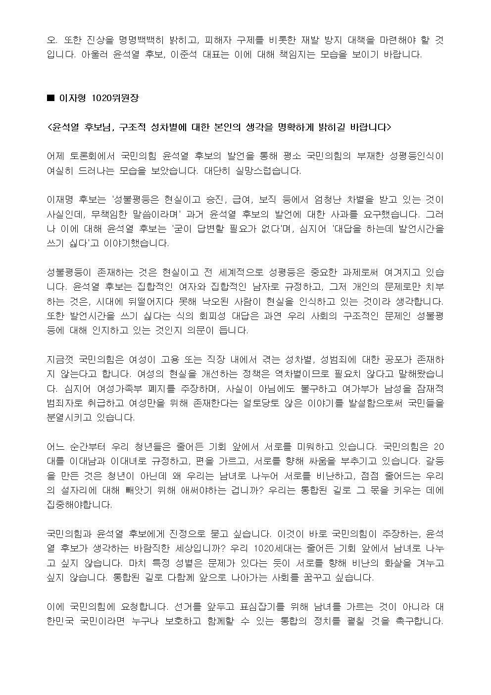 [기자회견문] 더불어민주당 다이너마이트 청년선대위 기자회견