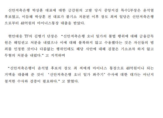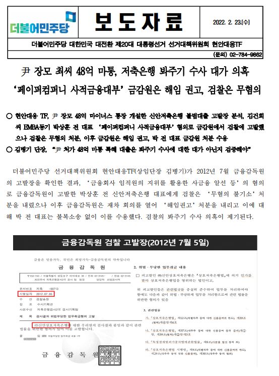 [보도자료] (더불어민주당 선대위 현안대응TF) 윤석열 장모 최씨 48억 마통, 저축은행 봐주기 수사 대가 의혹...금감원은 해임 권고, 검찰은 무혐의 불기소