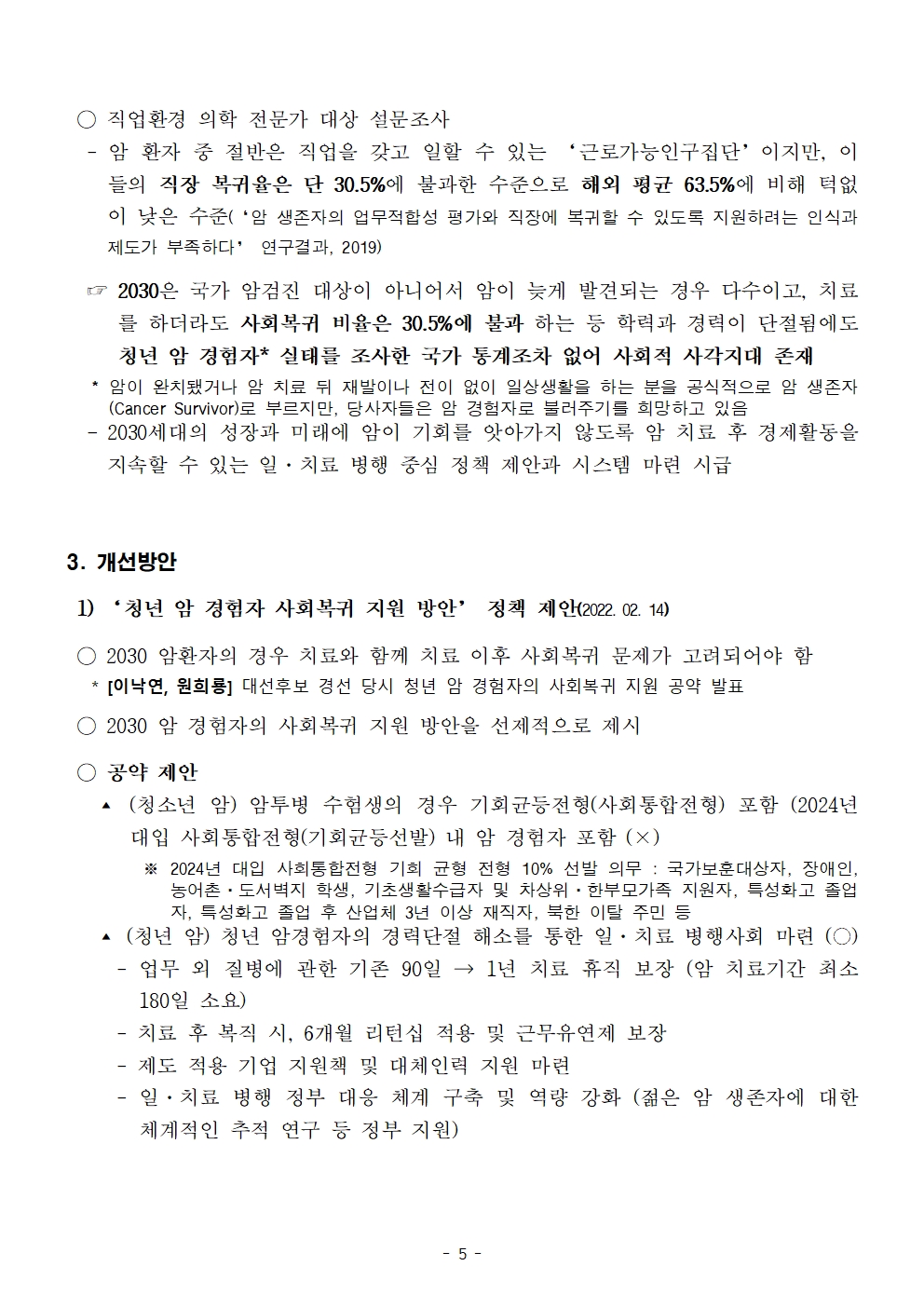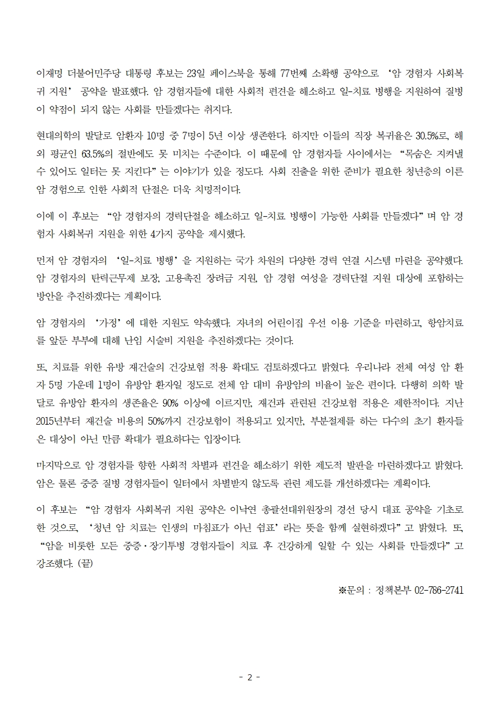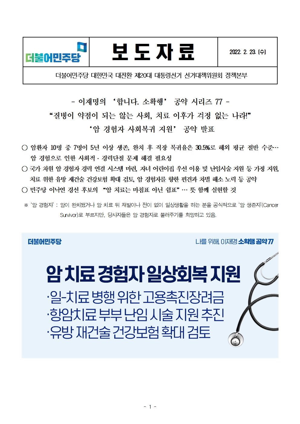 [보도자료] 더불어민주당 선대위 정책본부, '이재명은 합니다. 소확행 공약 시리즈 77' 암 경험자 사회복귀 지원 공약 발표