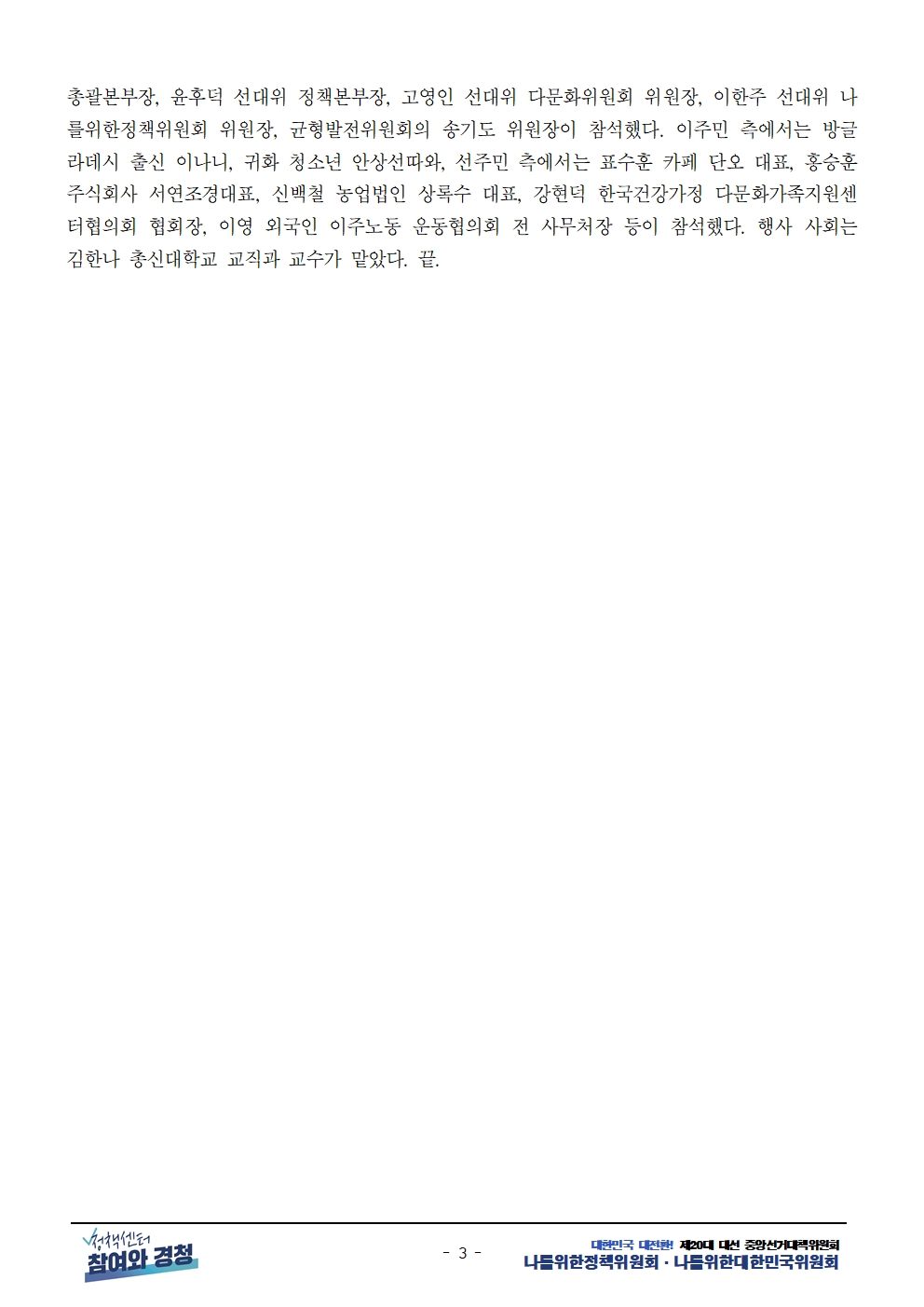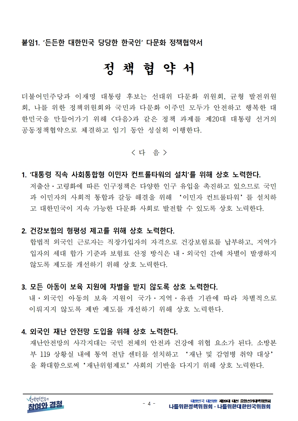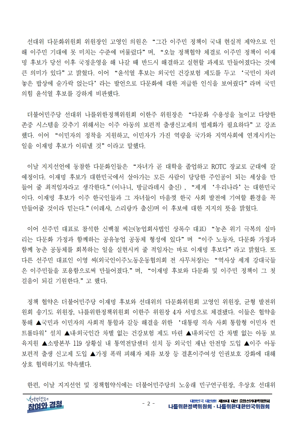 [보도자료] 더불어민주당 선대위 나를위한정책위원회, 다문화인 공동정책협약 체결 및 대선 연대 선언
