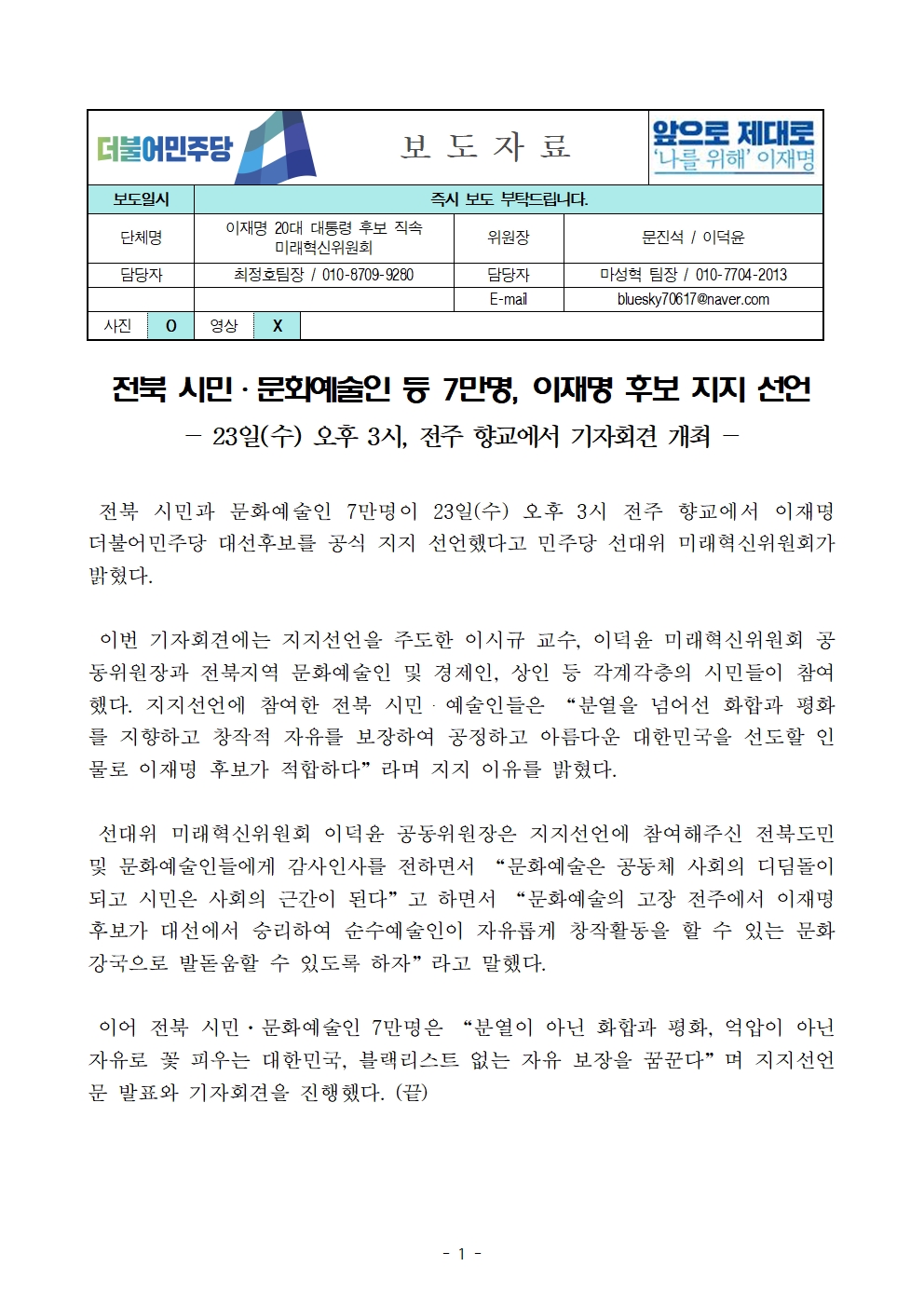 [보도자료] 더불어민주당 선대위 미래혁신위원회, 전북 시민·문화예술인 등 7만 명 후보 지지선언