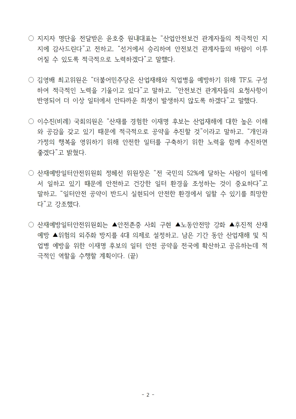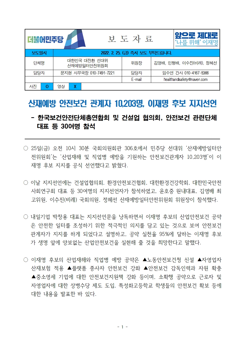 [보도자료] 더불어민주당 선대위 산재예방일터안전위원회, 산재예방 안전보건 관계자 10,203명 후보 지지선언