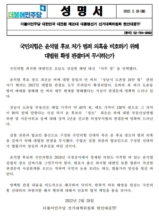 [성명서] 더불어민주당 선대위 현안대응TF, 국민의힘은 윤석열 후보 처가 범죄 의혹을 비호하기 위해 대법원 확정 판결마저 무시하는가