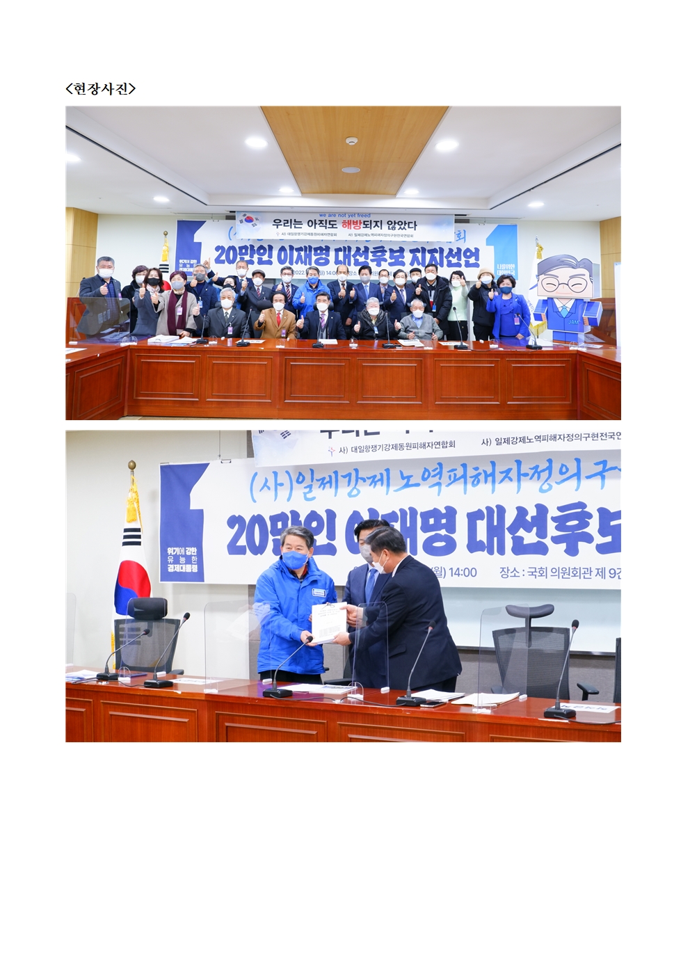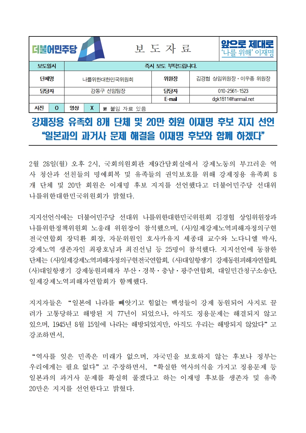 [보도자료] 더불어민주당 선대위 나를위한정책위원회, 강제징용 유족회 8개 단체 후보 지지선언