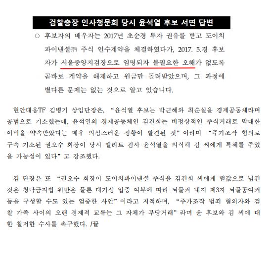 [보도자료] (더불어민주당 선대위 현안대응TF) 尹, 김건희 비상장 도이치파이낸셜 저가 매수 특혜 '청탁금지법', '뇌물죄' 의혹