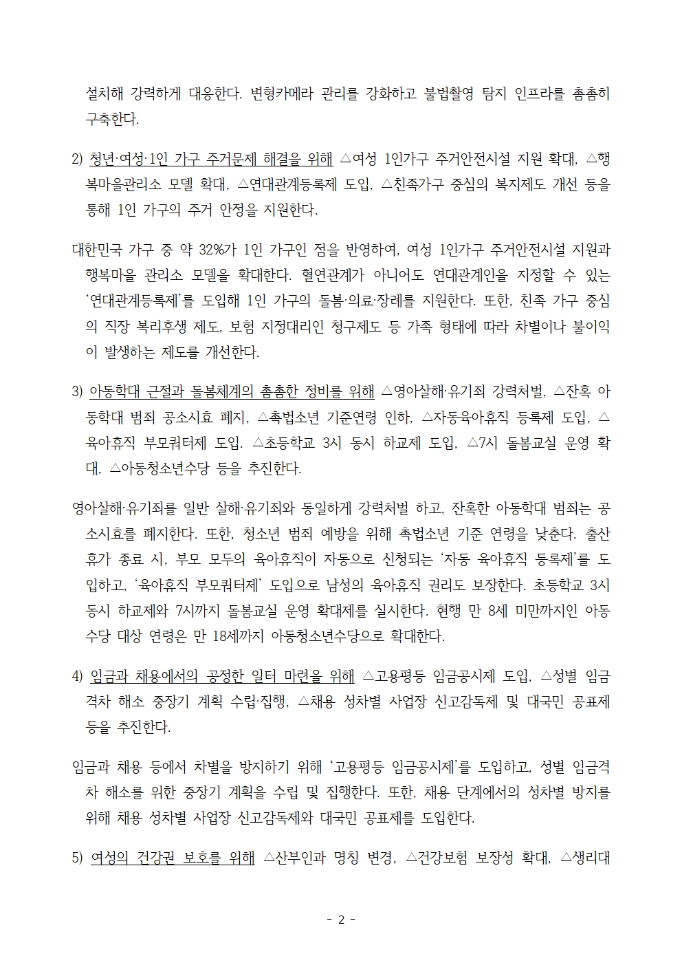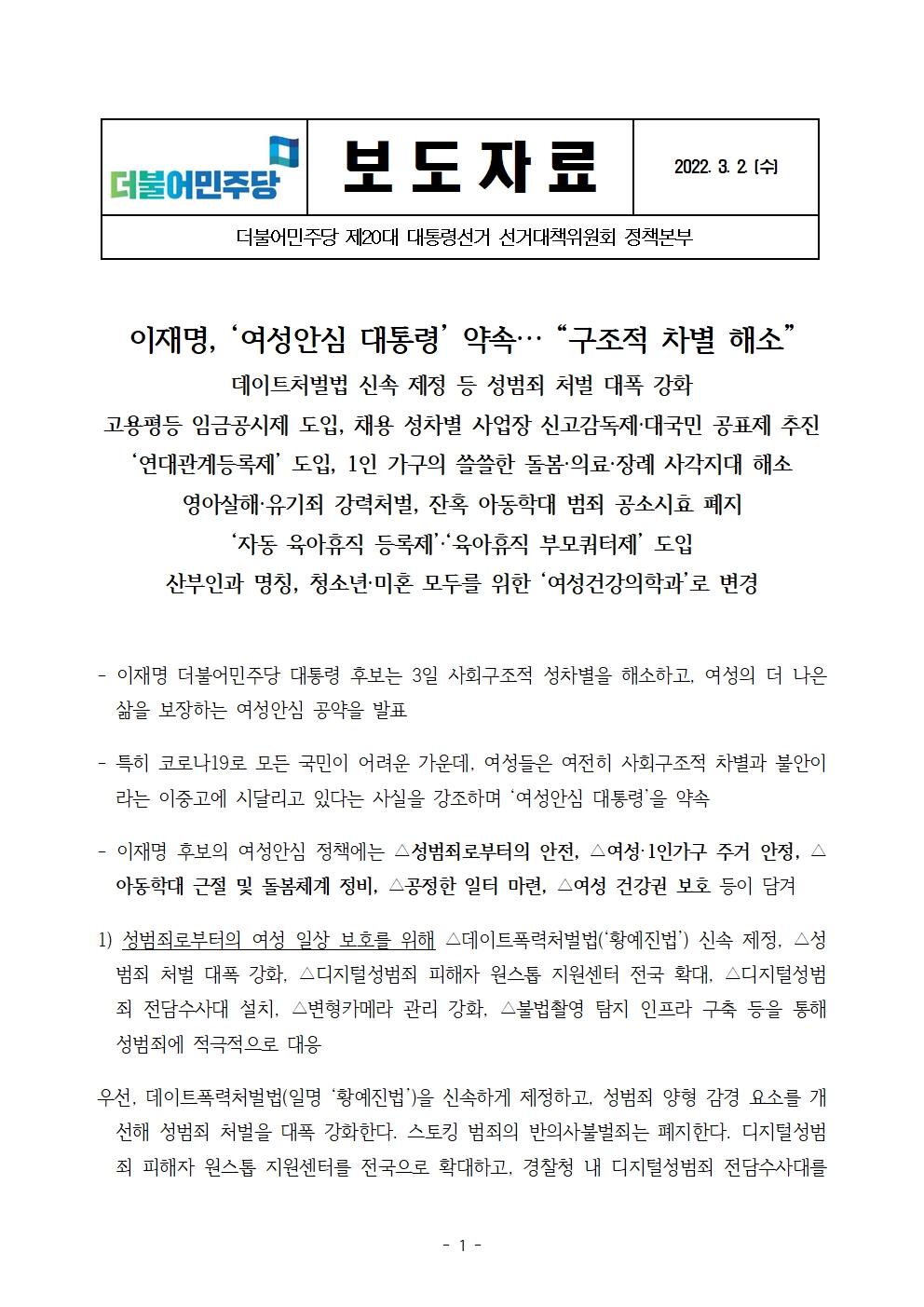 [보도자료] 더불어민주당 선대위 정책본부, 사회구조적 성차별 해소와 여성의 더 나은 삶 보장을 위한 여성안심 정책공약 발표