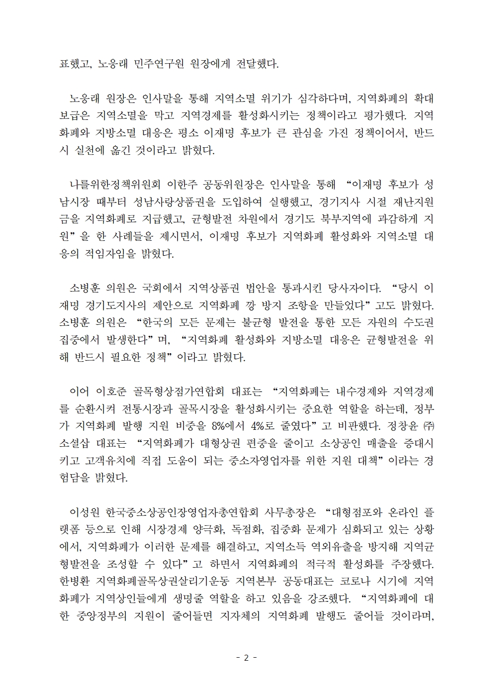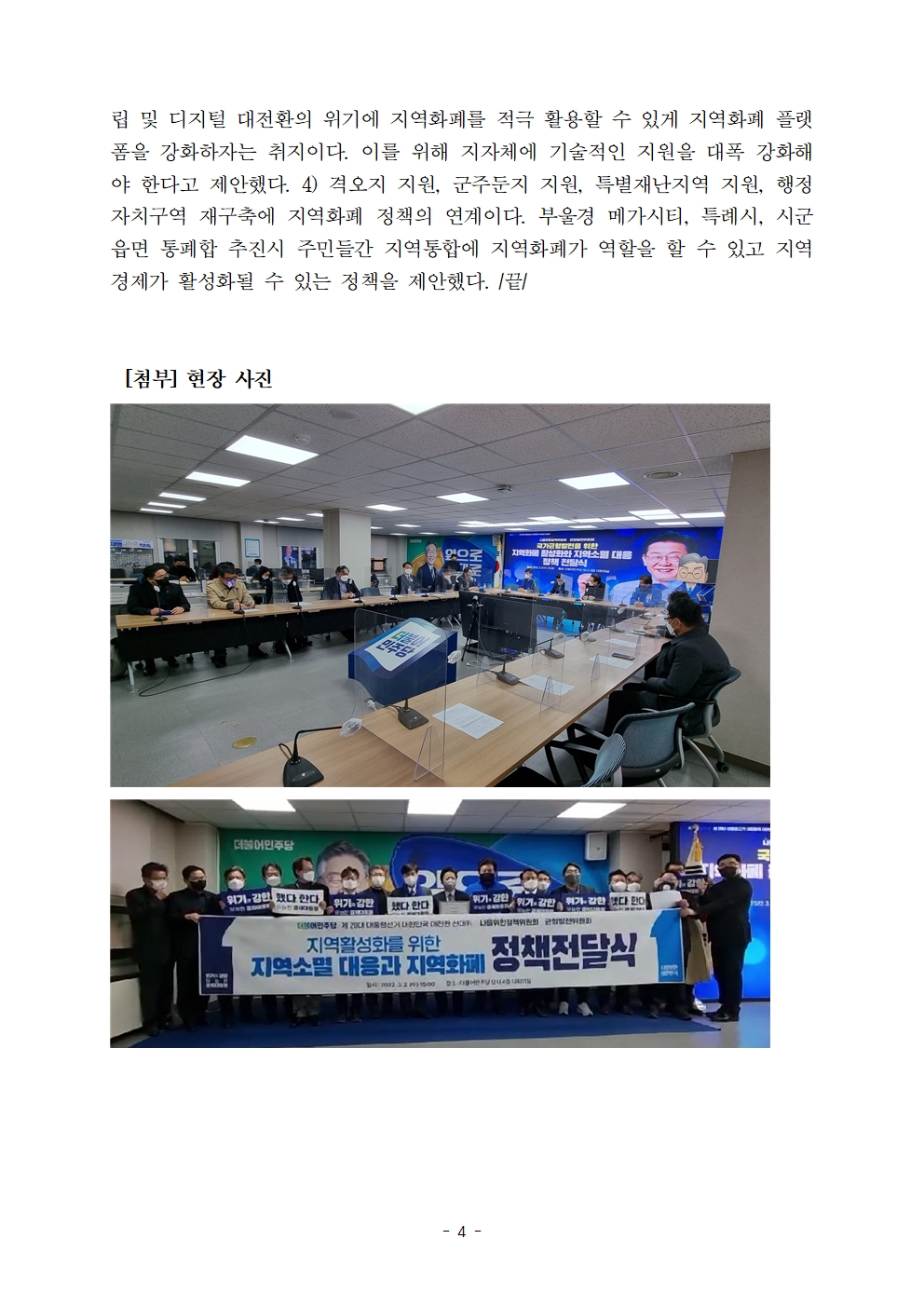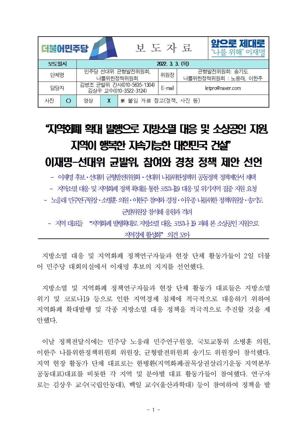 [보도자료] 더불어민주당 선대위 균형발전위원회·나를위한정책위원회, 지방소멸 대응 및 지역화폐 정책연구자 후보 지지선언 및 정책제안서 채택