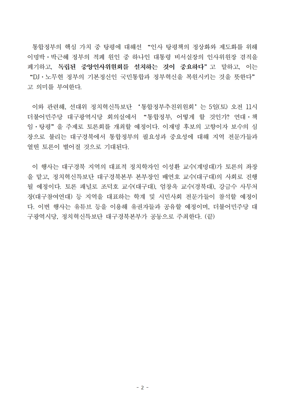 [보도자료] 더불어민주당 선대위 총괄특보단, ‘통합정부, 어떻게 할 것인가?’ 대구경북 통합정부 토론회 개최