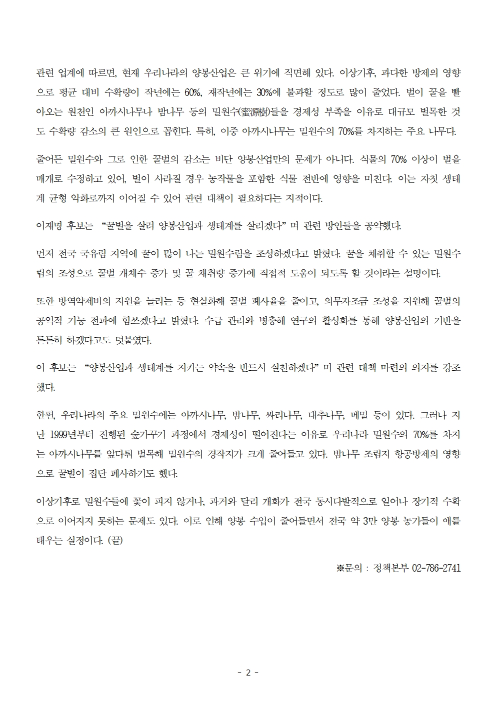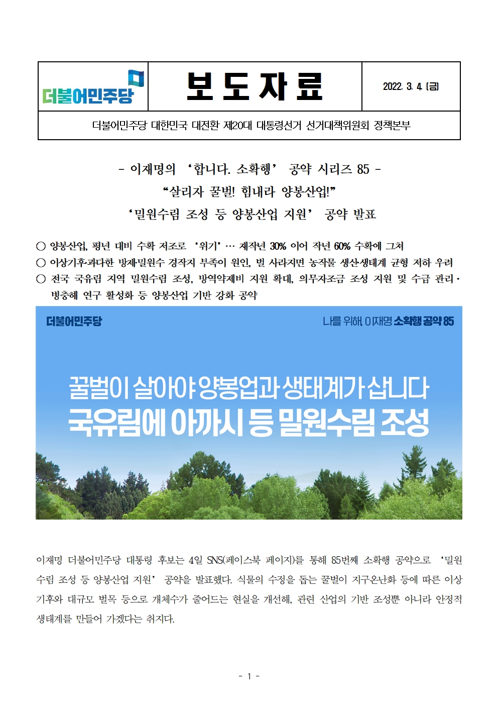 [보도자료] 더불어민주당 선대위 정책본부, '이재명은 합니다. 소확행 공약 시리즈 85' 밀원수림 조성 등 양봉산업 지원 공약 발표