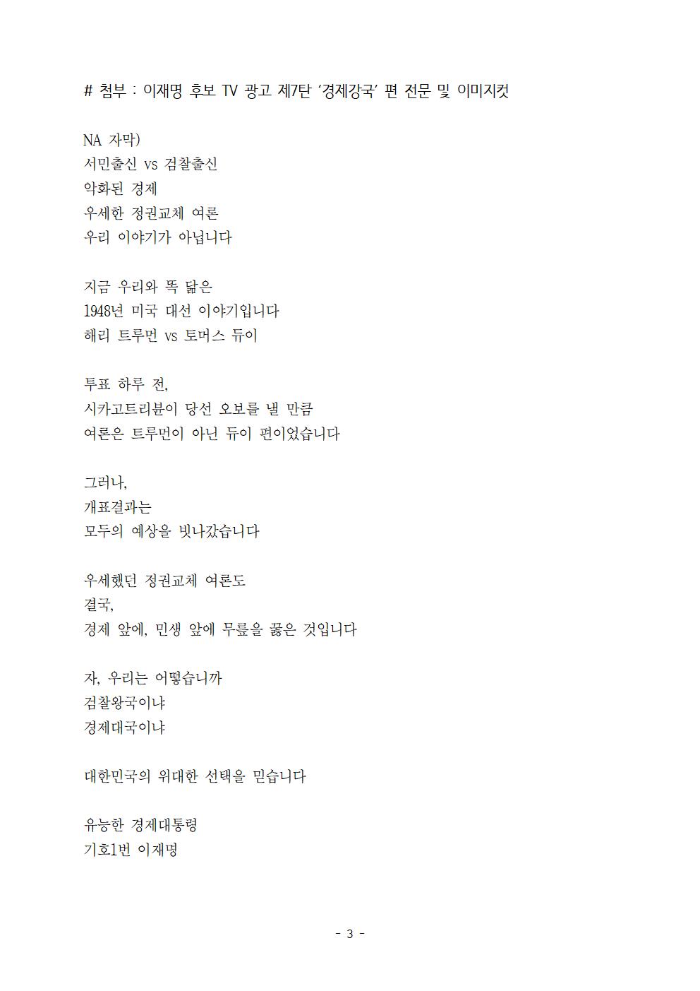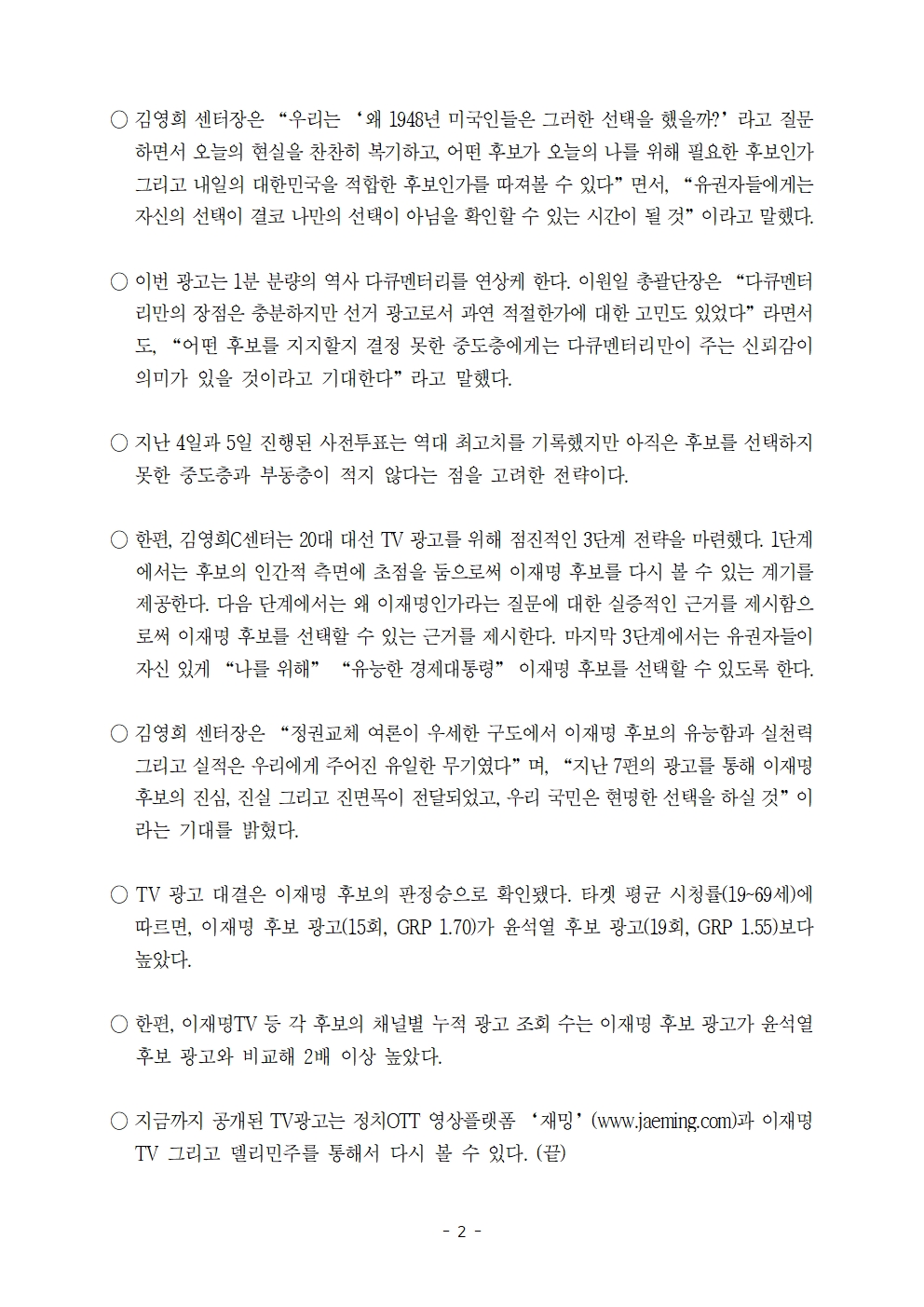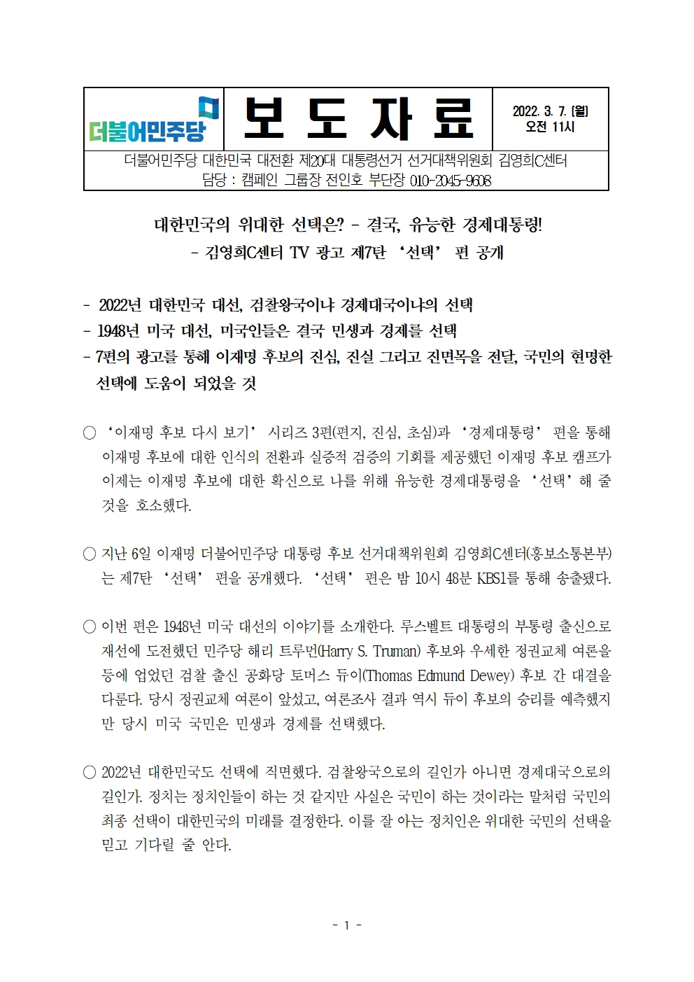 [보도자료] 더불어민주당 선대위 김영희C센터 TV광고 제7탄 '선택' 공개