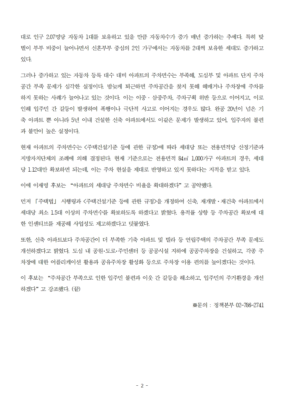 [보도자료] 더불어민주당 선대위 정책본부, '이재명은 합니다. 소확행 공약 시리즈 88' 주차공간 부족 문제 개선 공약 발표