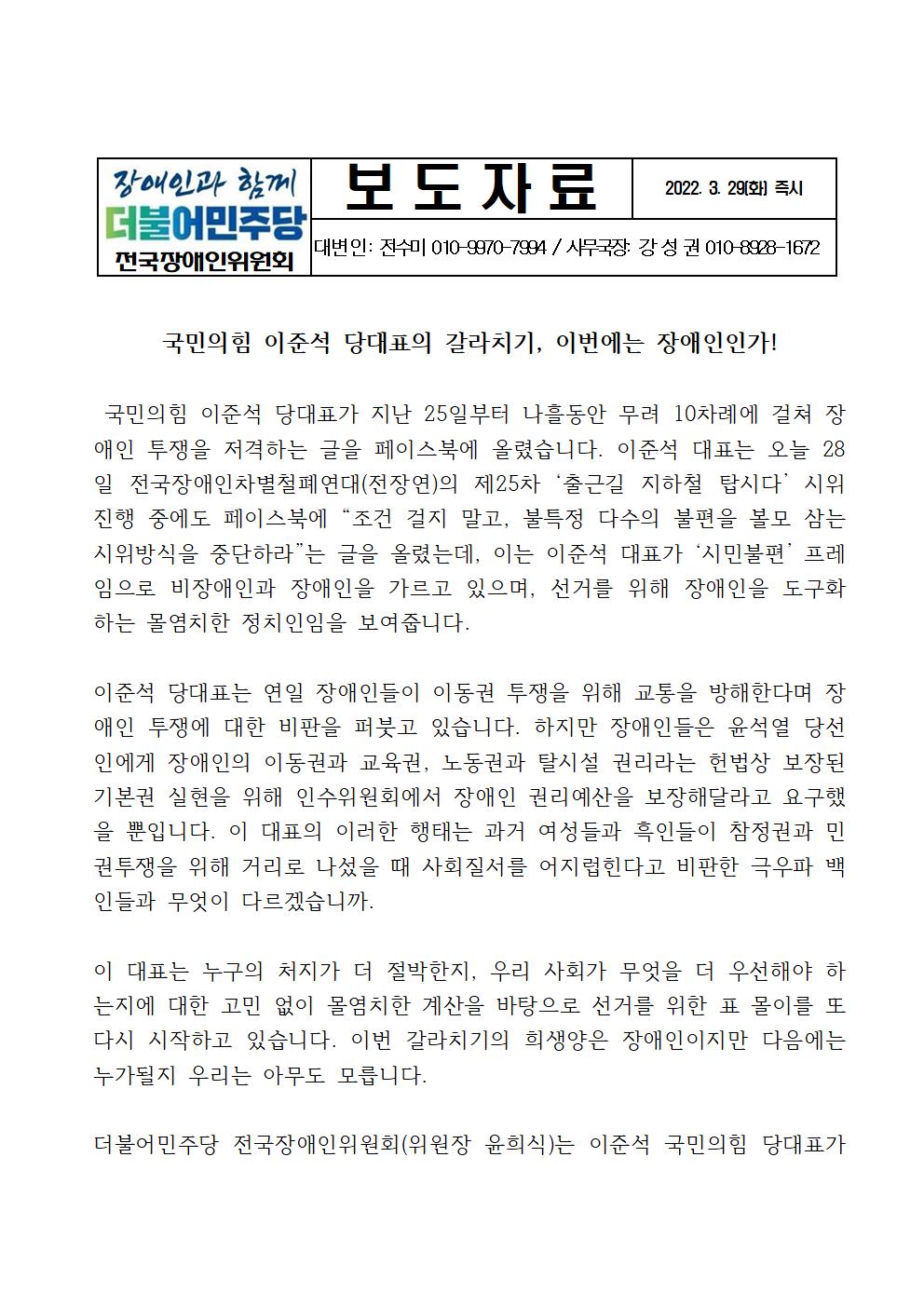 [보도자료] 더불어민주당 전국장애인위원회, 국민의힘 이준석 당대표의 갈라치기, 이번에는 장애인인가!