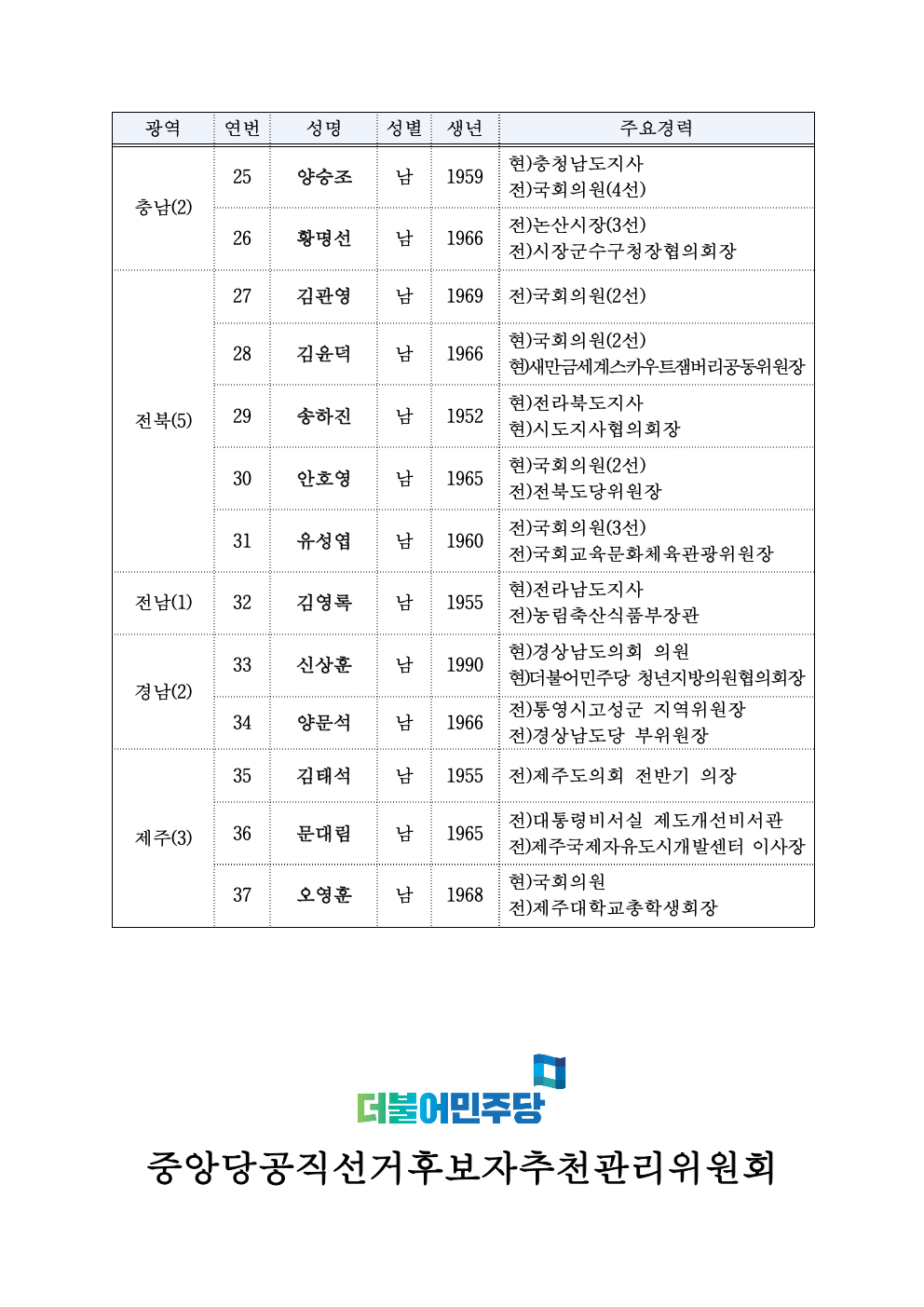 [보도자료]더불어민주당 제8회 전국동시지방선거 광역단체장 후보자 등록 결과