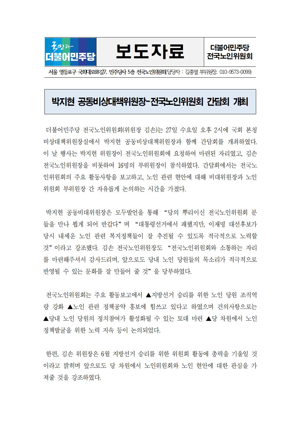 [보도자료] 더불어민주당 전국노인위원회, 박지현 공동비상대책위원장-전국노인위원회 간담회 개최
