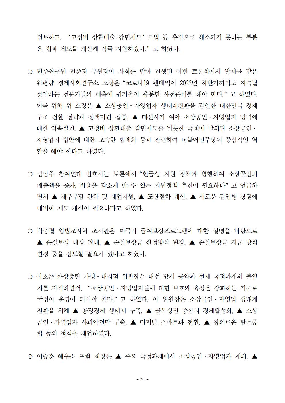 [보도자료] 더불어민주당 민주연구원, 코로나19 손실보상 제도개선 방안 정책토론회 개최