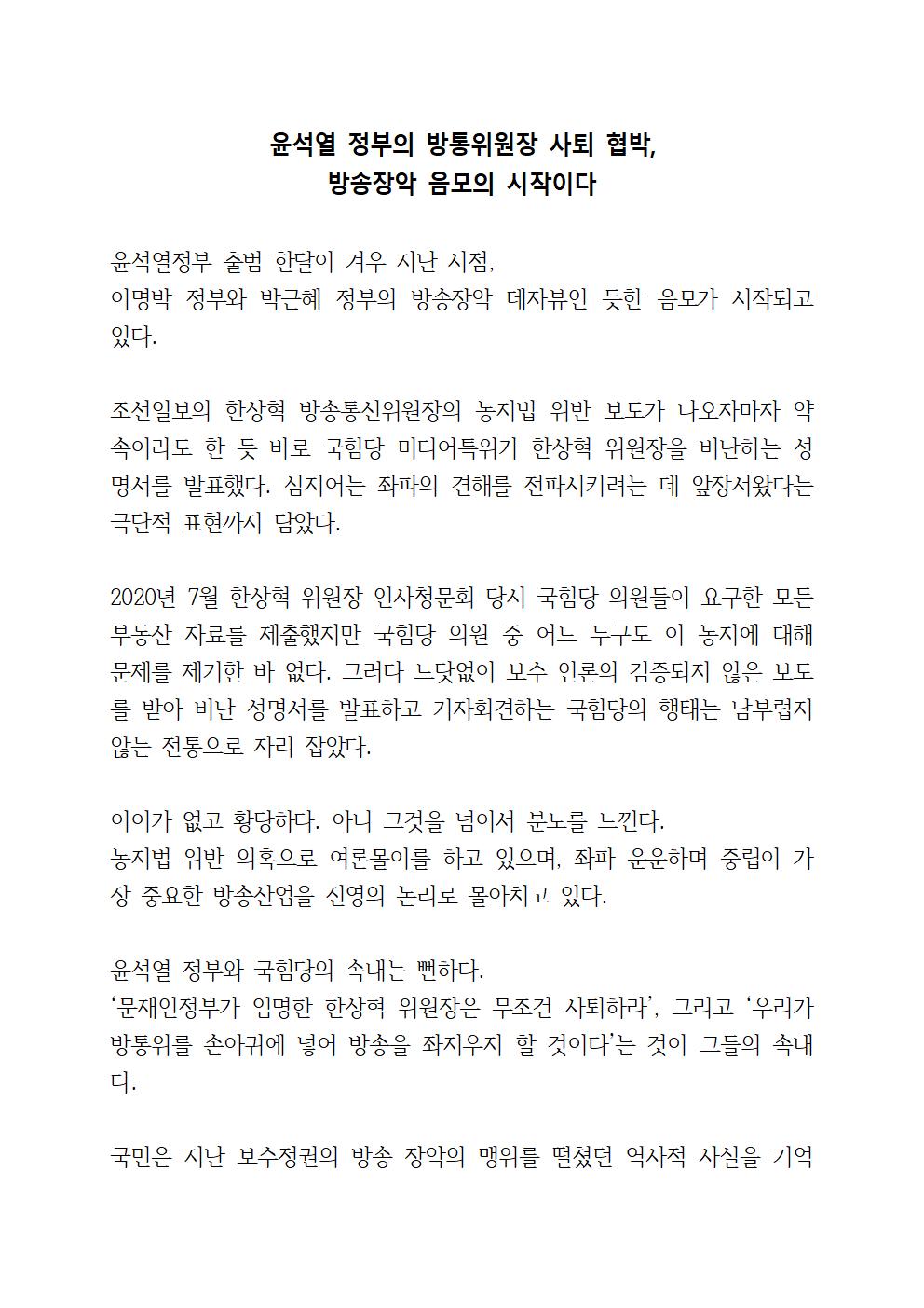 [기자회견문] 21대 국회 전반기 과방위원회 민주당 위원 일동, 윤석열 정부의 방통위원장 사퇴 협박, 방송장악 음모의 시작이다