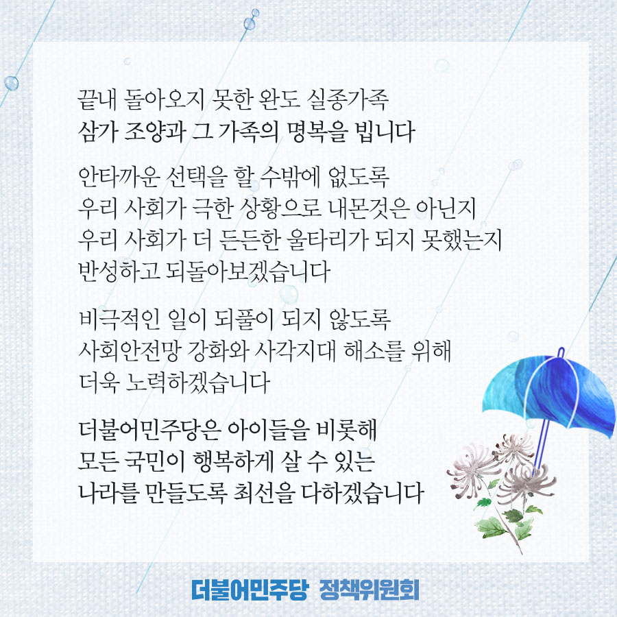 끝내 돌아오지 못한 완도 실종 가족, 삼가 조양과 그 가족의 명복을 빕니다