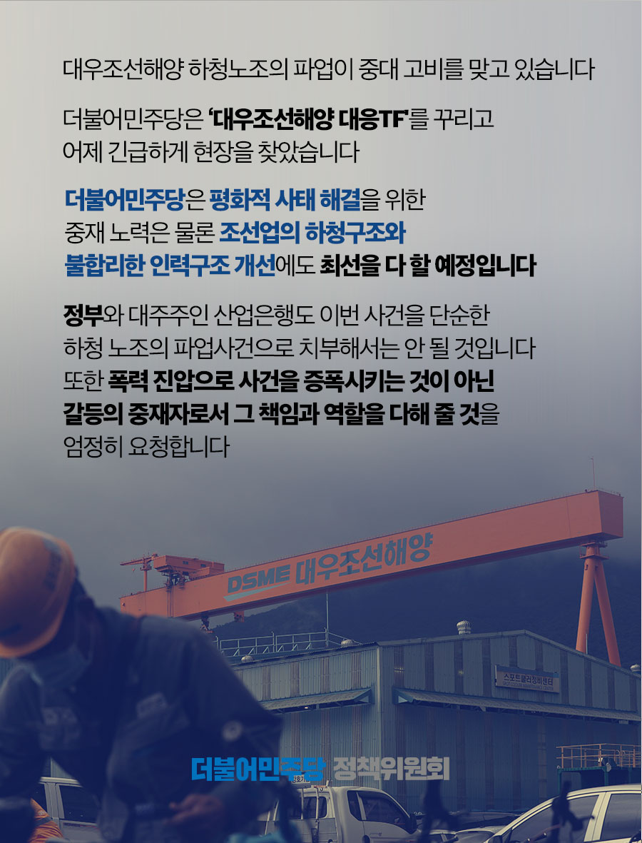 대우조선해양 하청노조 파업, 더불어민주당은 평화적 사태 해결을 위해 최선을 다하겠습니다