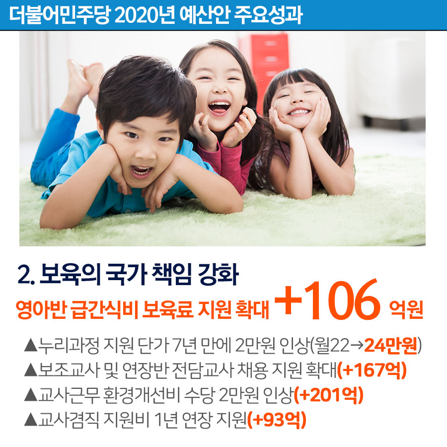2020 예산안 주요성과 : 영아반 급·간식비 보육료 지원확대! +106억
