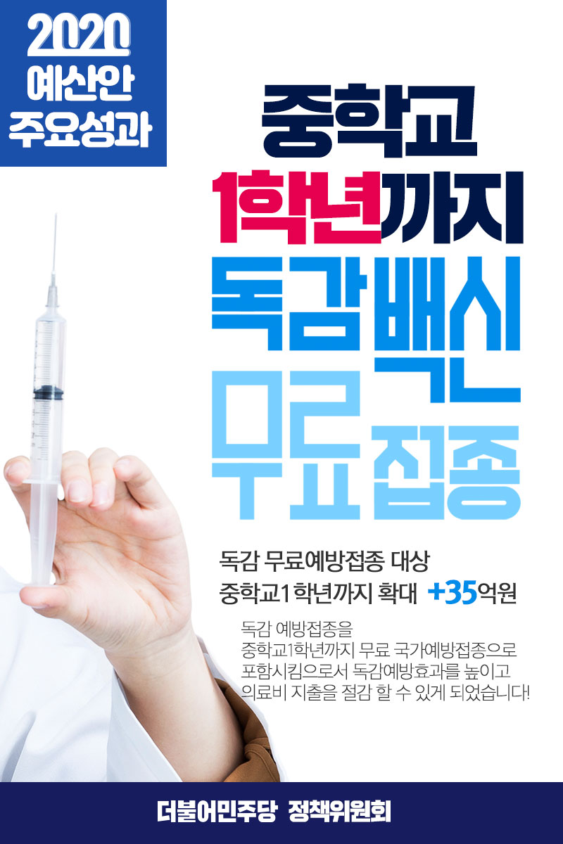 2020 예산안 주요성과 : 중학교 1학년까지 독감백신 무료접종!