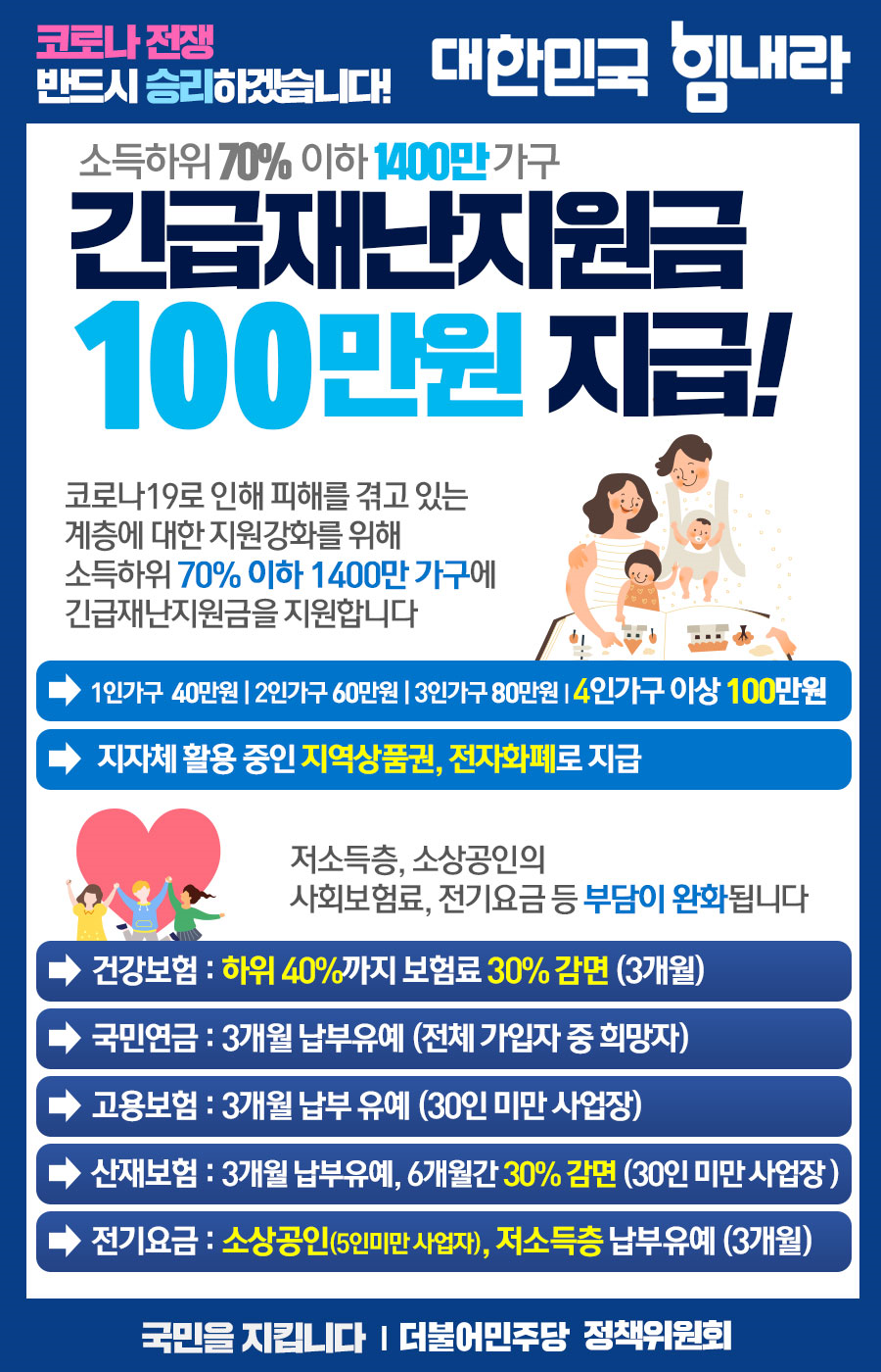 소득하위 70% 이하 1400만 가구, 긴급재난지원금 100만원 지급!