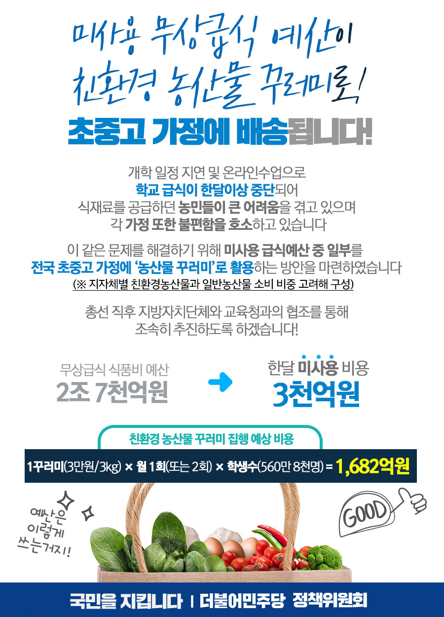 미사용 무상급식 예산이 친환경 농산물 꾸러미로 초중고 가정에 배송됩니다!
