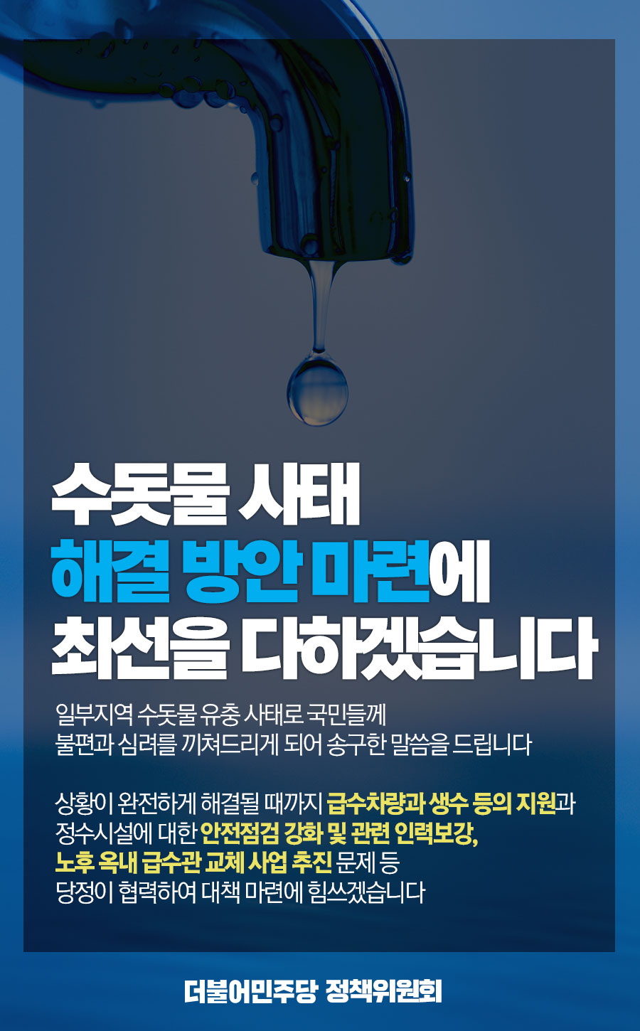 수돗물 사태 해결방안 마련에 최선을 다 하겠습니다.