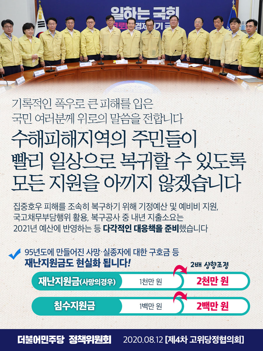 [제4차 고위당정협의회] 수해피해지역의 주민들이 빨리 일상으로 복귀할 수 있도록 모든 지원을 아끼지 않겠습니다