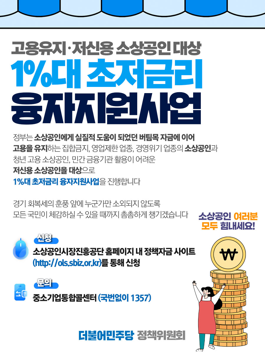 고용유지·저신용 소상공인 대상! 1%대 초저금리 융자지원사업!