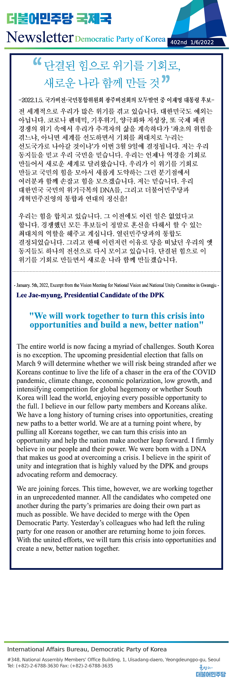 [401st Newsletter]Excerpt from Remarks of DPK’s Presidential Candidate Lee Jae-myung at the 2022 Ope