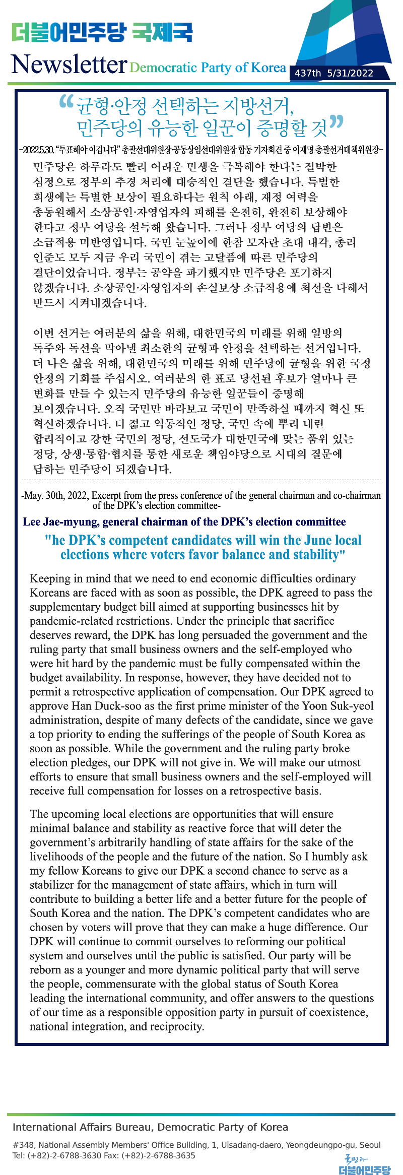 [436th Newsletter] Excerpt from the Remarks of the Party’s Election Committee Joint Meeting