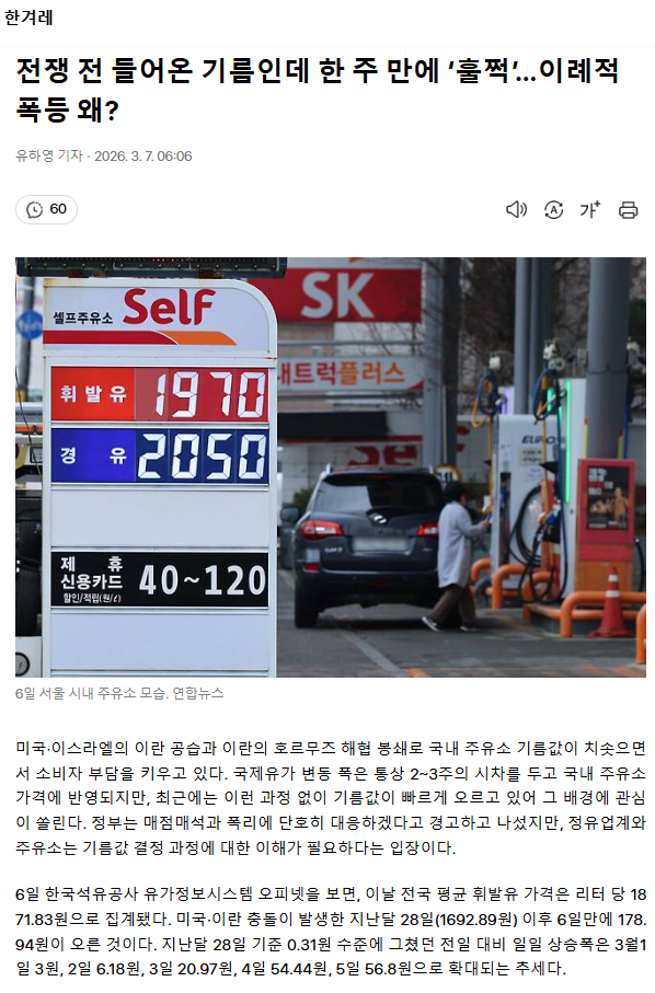 전쟁 전 들어온 기름인데 한 주 만에 ‘훌쩍’… 이례적 폭등 왜?