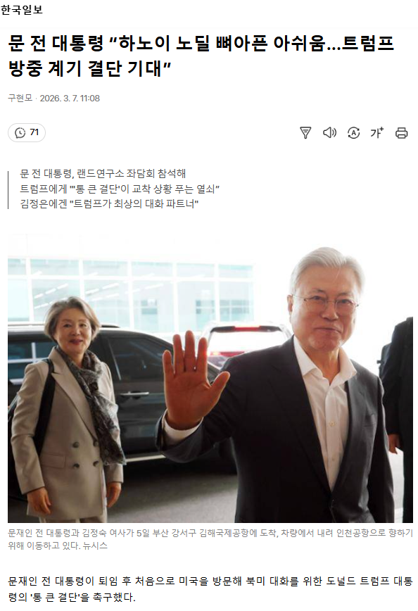 문 전 대통령 “하노이 노딜 뼈아픈 아쉬움... 트럼프 방중 계기 결단 기대”
