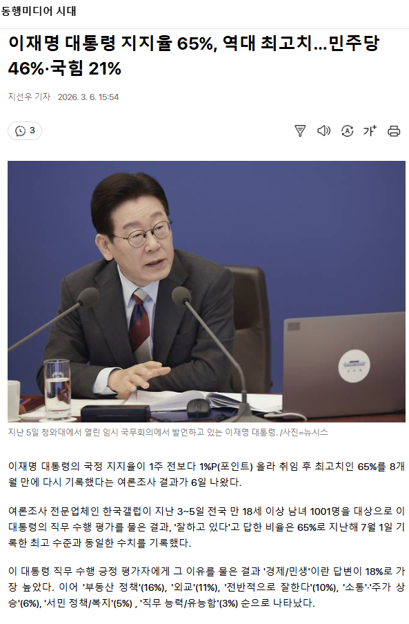 이재명 대통령 지지율 65%, 역대 최고치… 민주당 46%·국힘 21%