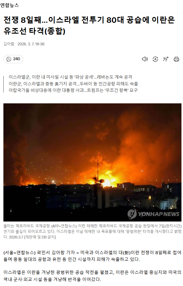 전쟁 8일째… 이스라엘 전투기 80대 공습에 이란은 유조선 타격 (종합)