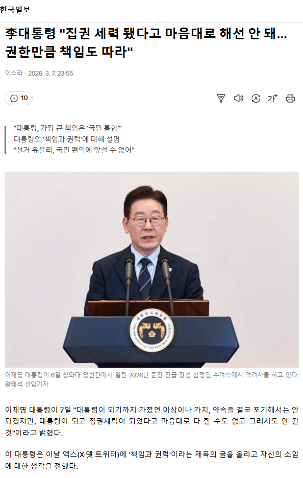 李대통령 "집권 세력 됐다고 마음대로 해선 안 돼… 권한만큼 책임도 따라"