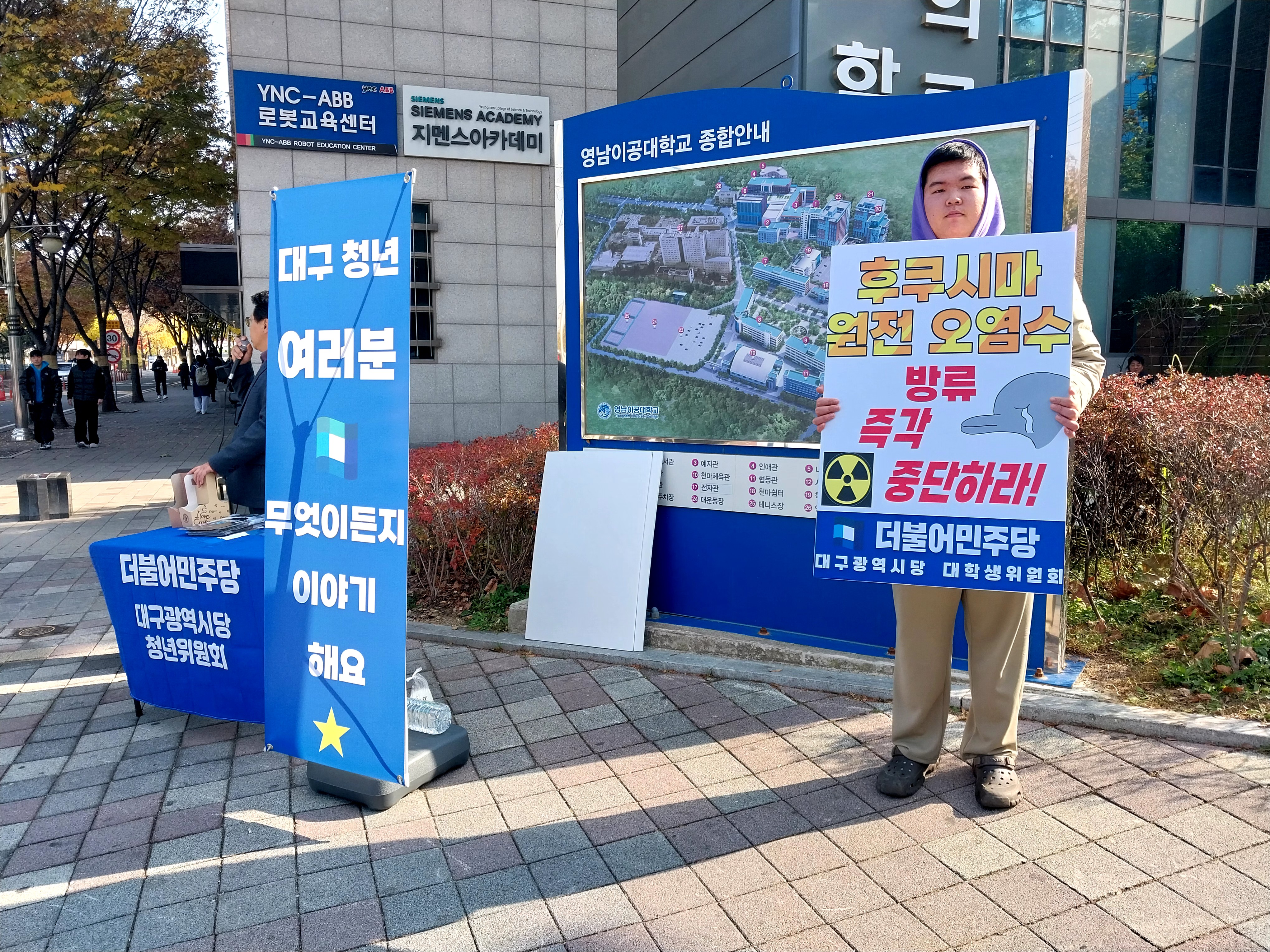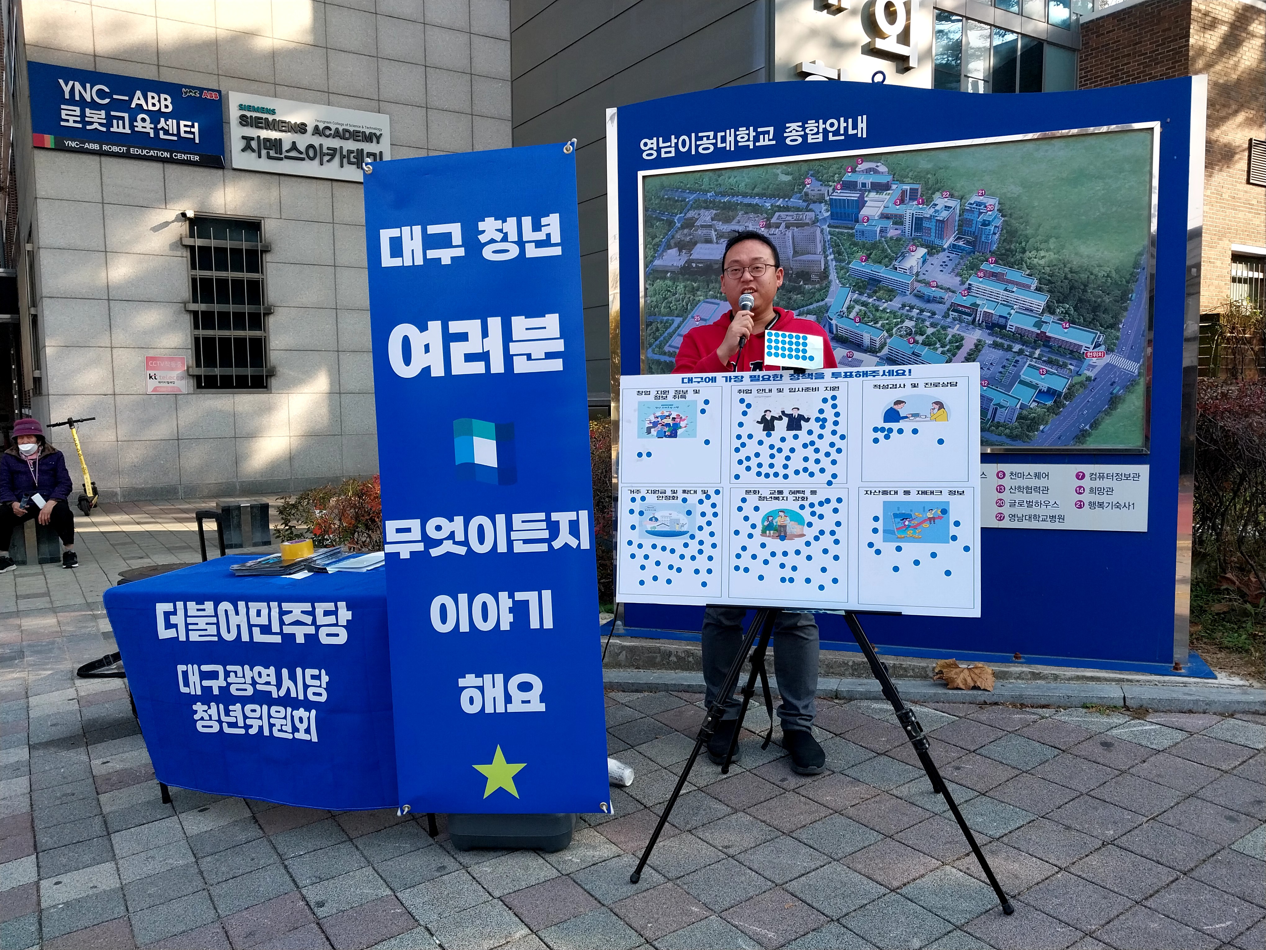 영남이공대학교 정문안녕하십니까, 청년위 장우석입니다. 지난번 계명대학교에서 진행한 청대원소 행사를 이어 이번에 청대원소 행사는 영남이공대학교 정문에서 진행 했습니다. 점심을 먹으러 많은 대학생들과 청년들이 나오면서 응원을 하는 분들도 있으셨고 가끔 비난을 하는 분들도 있었습니다. 영남이공대학교는 유난히 청년 취업에 대해서 관심이 매우 높았습니다. 다음달 12월달에 영남대에서 진행할 청대원소 행사 역시 많은 관심 부탁 드리겠습니다!