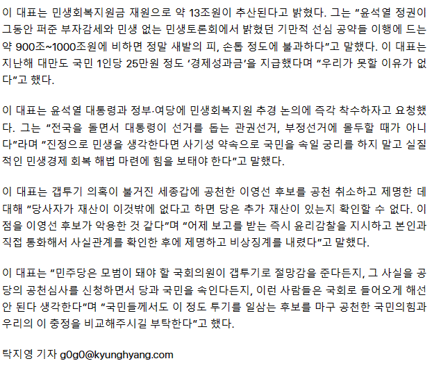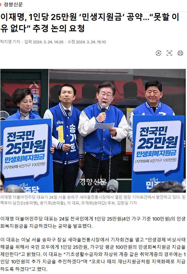 이재명, 1인당 25만원 ‘민생지원금’ 공약…“못할 이유 없다” 추경 논의 요청