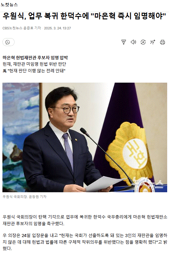 우원식, 업무 복귀 한덕수에 "마은혁 즉시 임명해야"