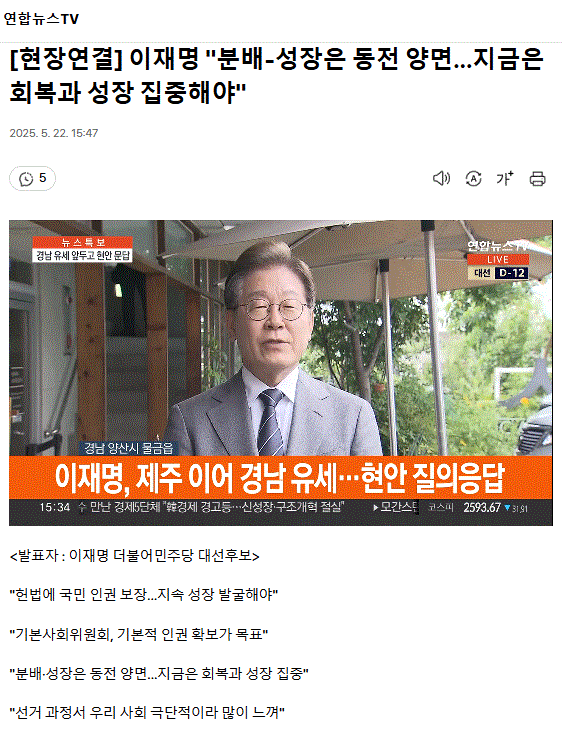 [현장연결] 이재명 "분배-성장은 동전 양면… 지금은 회복과 성장 집중해야"