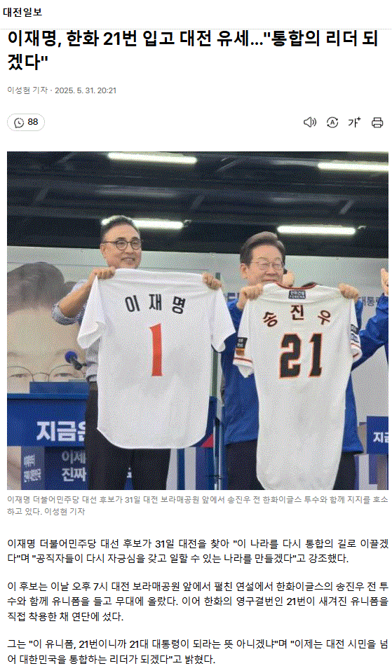 이재명, 한화 21번 입고 대전 유세… "통합의 리더 되겠다"