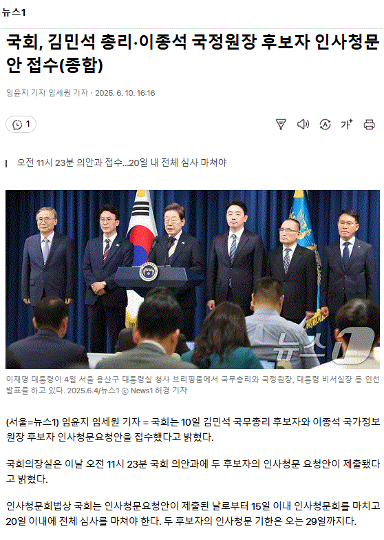 국회, 김민석 총리·이종석 국정원장 후보자 인사청문안 접수(종합)