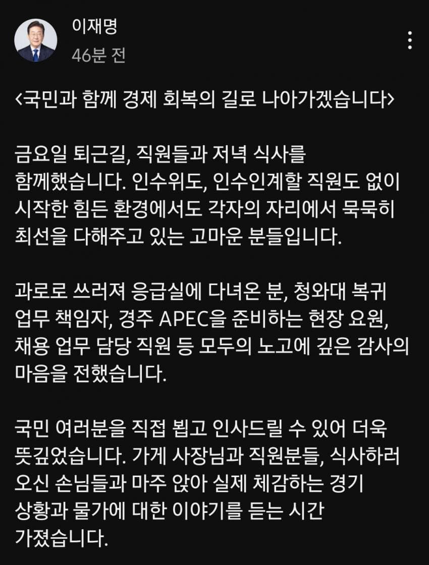 이재명 대통령 페북 "골목이 살아야 경제가 삽니다"