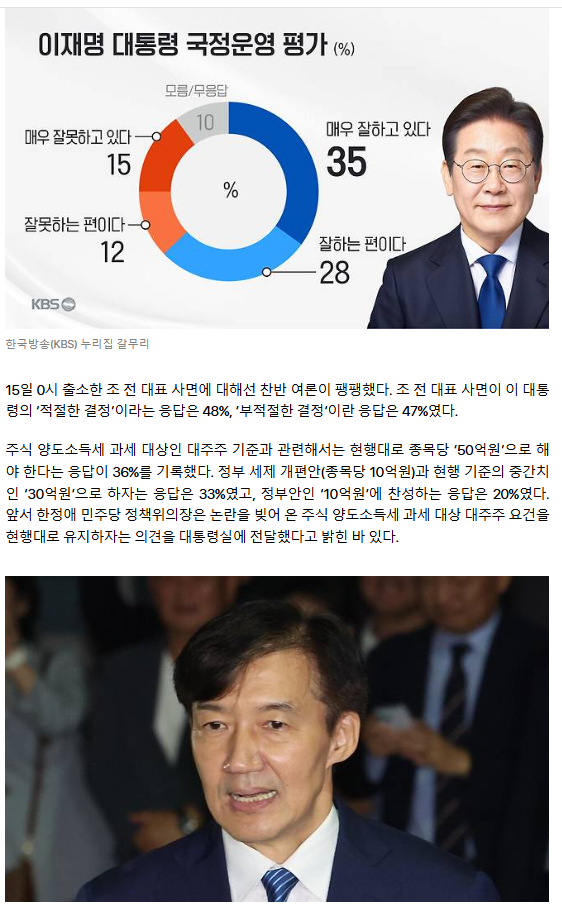 이 대통령 지지율 63%… ‘조국 사면’ 적절 48% vs 부적절 47%
