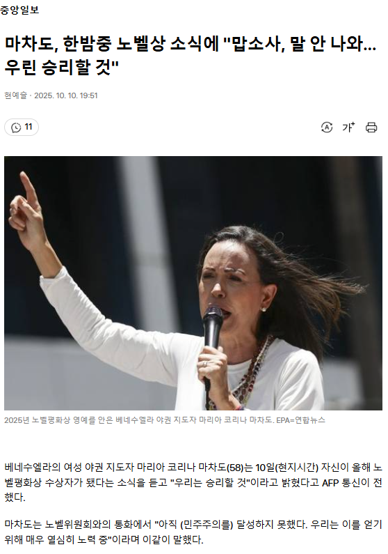 마차도, 한밤중 노벨상 소식에 "맙소사, 말 안 나와… 우린 승리할 것" ㅡ 트럼프 어쩌나