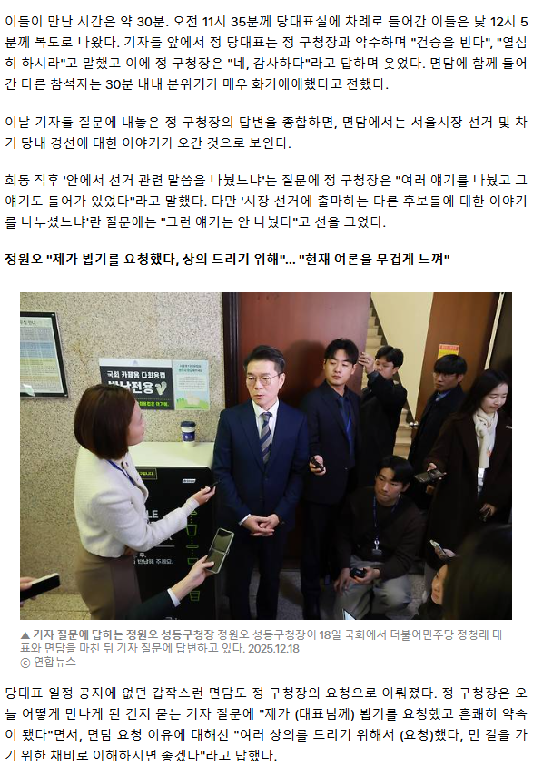 정원오, 민주당 당대표에 '급' 면담 요청... 30분 회동 뒤 "먼 길 위한 채비"